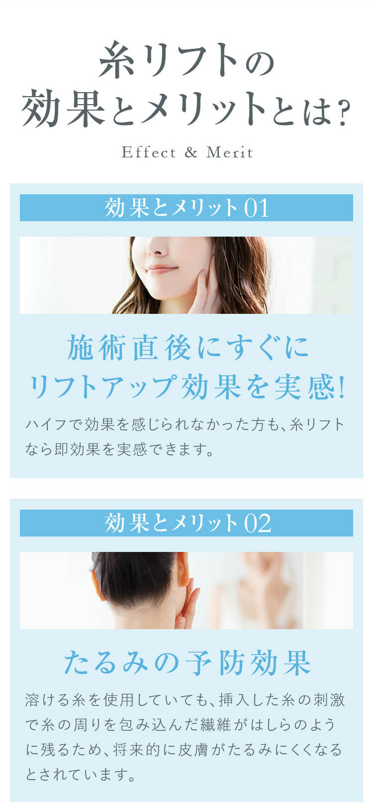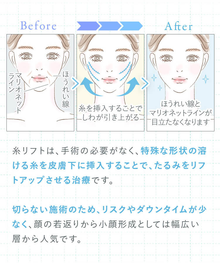 糸リフトは、軽度から中等度のたるみが気になる30代から50代の方に特に効果的です。ただし、個々の皮膚状態や希望する結果によっては、他の年齢層の方でも施術を受けることが可能です。
